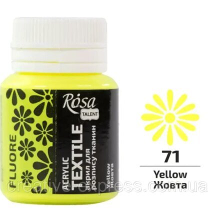 Фарба акрилова для тканин, Жовта, флуоресцентна, 20 мл, ROSA TALENT