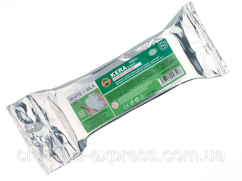 Полегшений пластилін Keraplast. Ідеально підходить для легких виробів (намиста, підвісок і т.д.). На основі натуральної глини. Твердне на повітрі протягом 24 годин. Не потребує термообробки. Готову роботу можна розфарбовувати. Безпечний для дітей. Відповідає європейським стандартам безпеки.