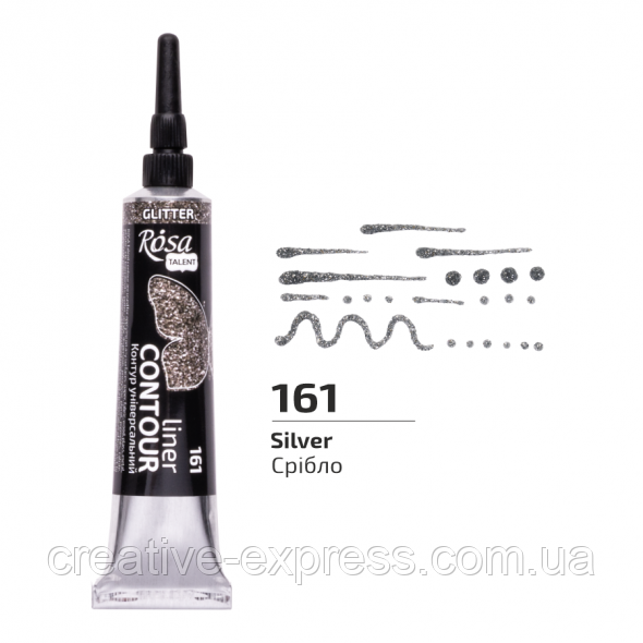 Контури з глітерами двох видів: Золото та Срібло, мають ефект іскристого сяйва завдяки вмісту дрібних глітерів. Вони чудово підійдуть для створення цікавих, святкових ефектів на листівках, запрошенях чи інших святкових аксесуарах.