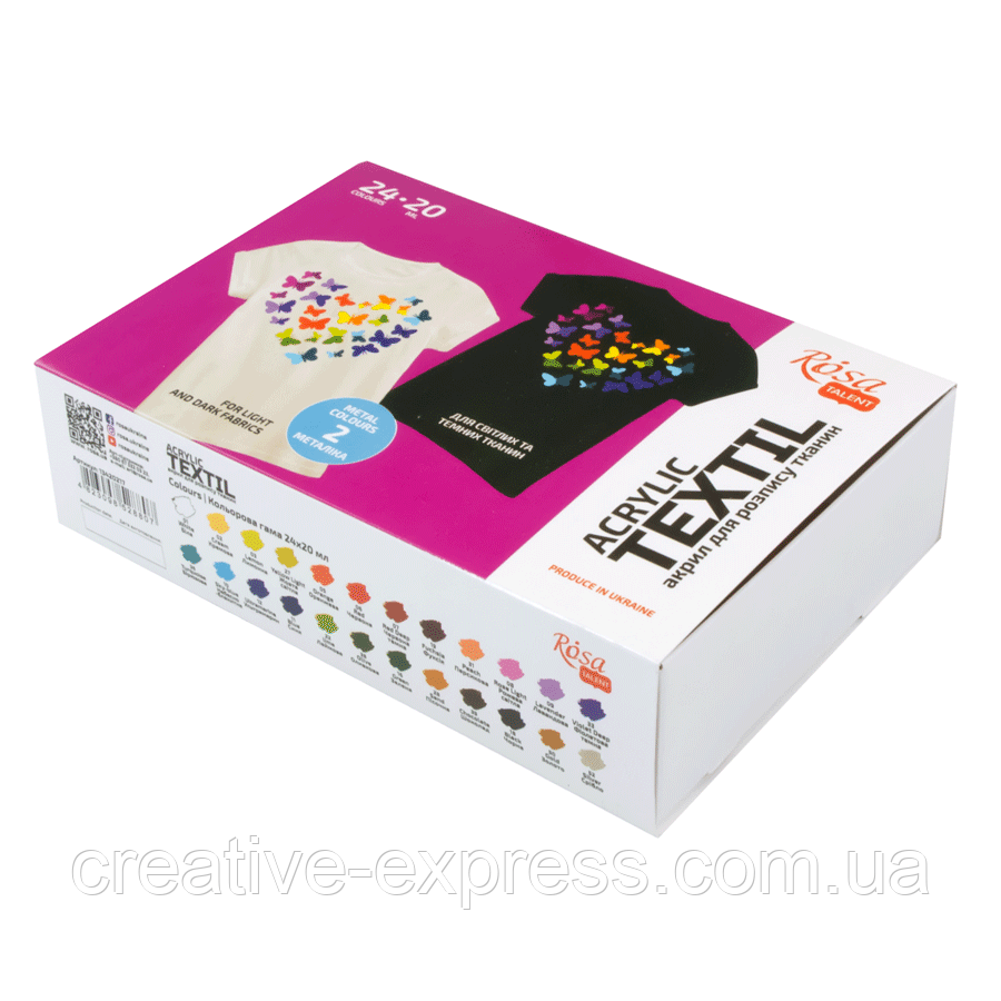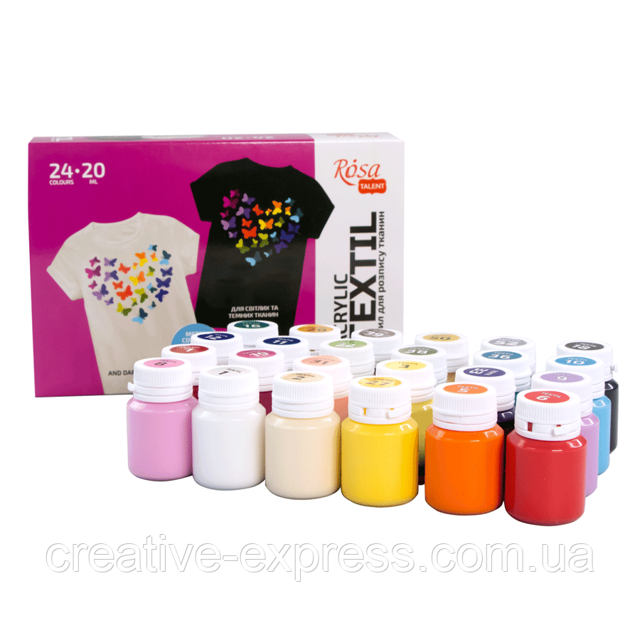 Набір акр.фарб для розпису тканин HEART, 24кол., 20мл, в т.ч. 2металіка, ROSA TALENT