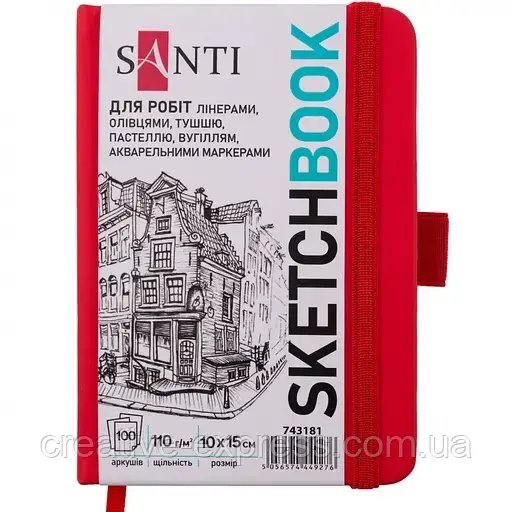 Скетчбук SANTI для графіки, 10х15см, 100 арк., тверда обкладинка PU, 110г/м2, червоний
