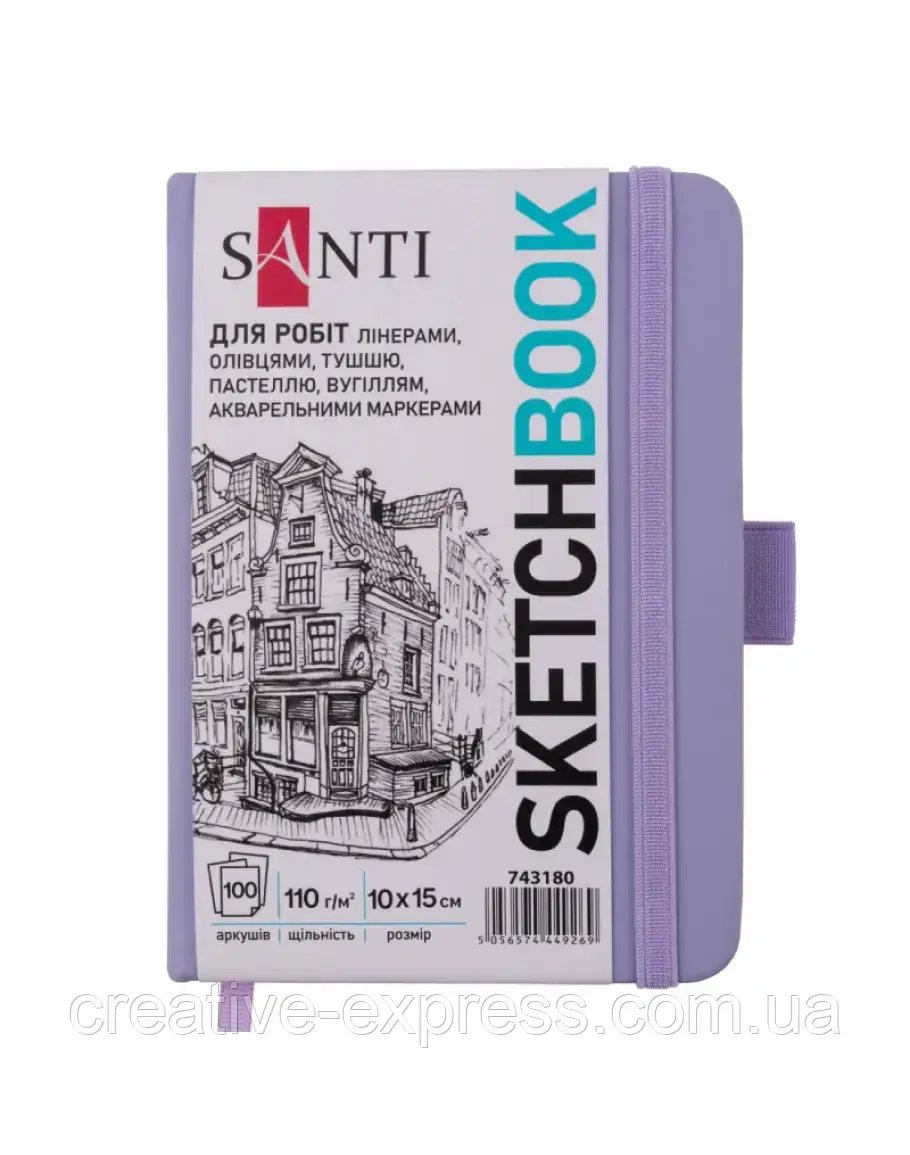 Скетчбук SANTI для графіки, 10х15см, 100 арк., тверда обкладинка PU, 110г/м2, фіолетовий