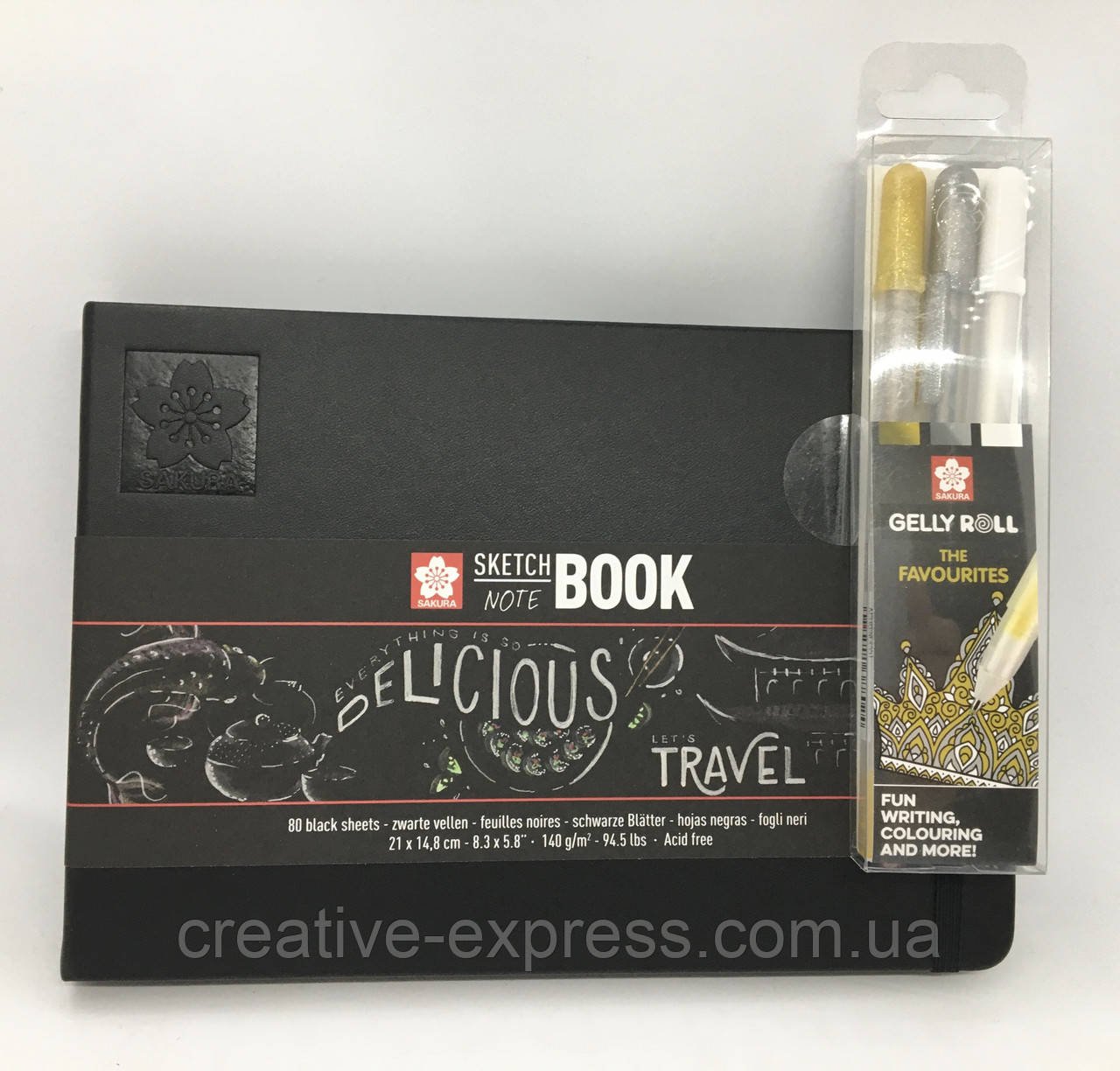 Акція! Блокнот Sakura Sketch, 140 г/м2, 21х14,8 см, 80 л, чорний + Набір гелевих ручок Gelly Roll, 3