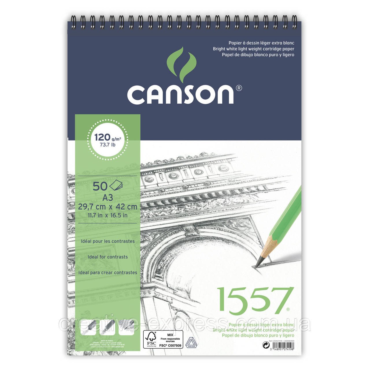 Папір “1557” від фірми Canson була колись розроблена спеціально для того, щоб художники могли в своїх роботах підкреслити, при необхідності, контрастність кольорів. Папір виробляється без додавання кислот. Висока щільність дозволяє багаторазово правити роботу. Особлива просочення забезпечує успішне втілення графічних ідей і сприяє тривалому зберіганню результату. Білосніжна поверхня має легку зернисту фактуру. Зерно паперу не дуже гладке, але і не дуже помітне, що дає нейтральну і тонку поверхню, яка відмінно підійде для ескізів і малюнків в “сухих техніках”. Папір “1557” можна багато в чому вважати універсальною: вона ідеальна для олівців, пастелі, вугілля і маркерів, але також підійде і для акварелі, гуаші, чорнила і ручок. У альбомів з папером “1557” задня частина обкладинки зроблена з щільного картону, що дає можливість малювати “на вазі”.