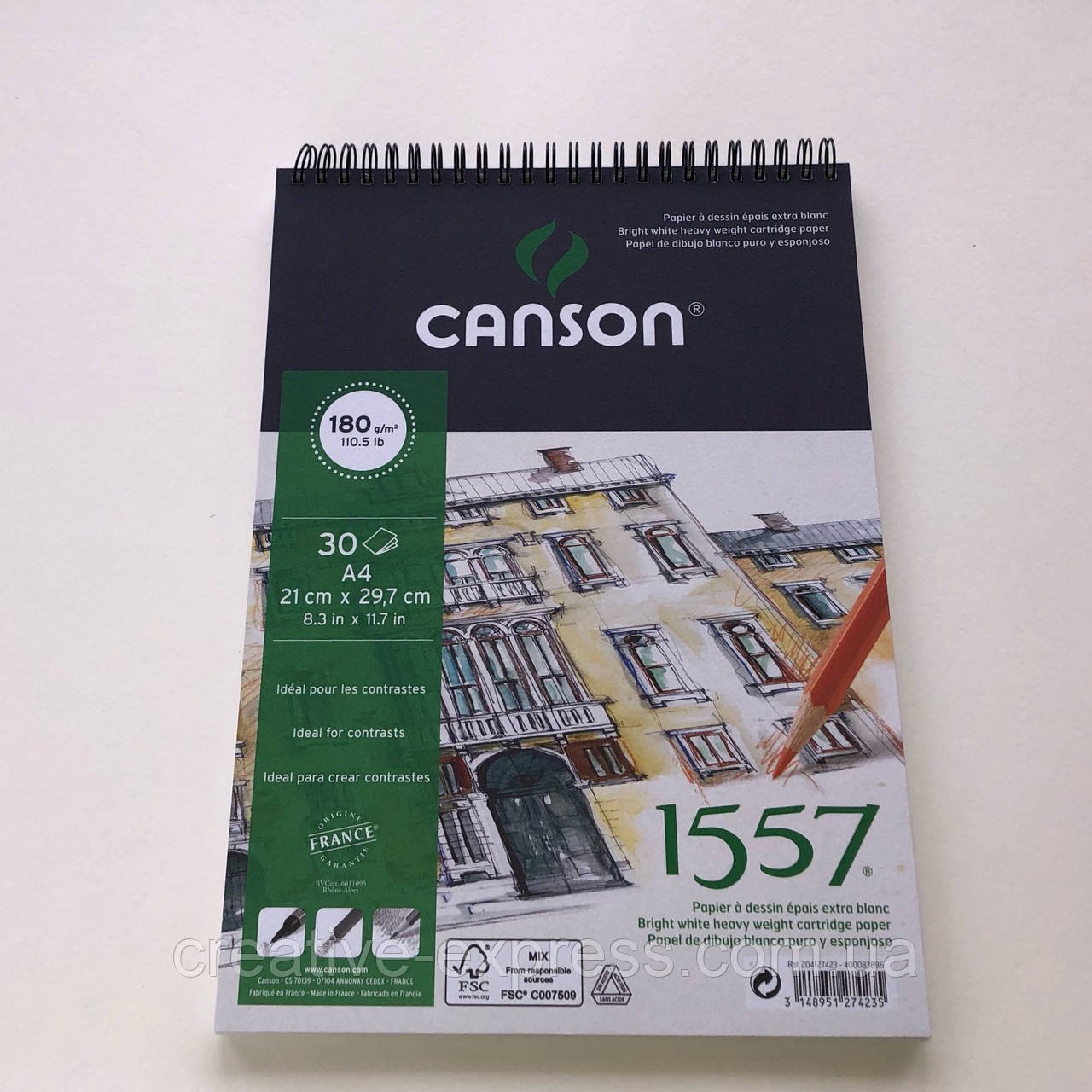 Папір “1557” від фірми Canson була колись розроблена спеціально для того, щоб художники могли в своїх роботах підкреслити, при необхідності, контрастність кольорів. Папір виробляється без додавання кислот. Висока щільність дозволяє багаторазово правити роботу. Особлива просочення забезпечує успішне втілення графічних ідей і сприяє тривалому зберіганню результату. Білосніжна поверхня має легкий од зернисту фактуру. Зерно паперу не дуже гладке, але і не дуже помітне, що дає нейтральну і тонку поверхню, яка відмінно підійде для ескізів і малюнків в “сухих техніках”. Папір “1557” можна багато в чому вважати універсальною: вона ідеальна для олівців, пастелі, вугілля і маркерів, але також підійде і для акварелі, гуаші, чорнила і ручок. У альбомів з папером “1557” задня частина обкладинки зроблена з щільного картону, що дає можливість малювати “на вазі”.