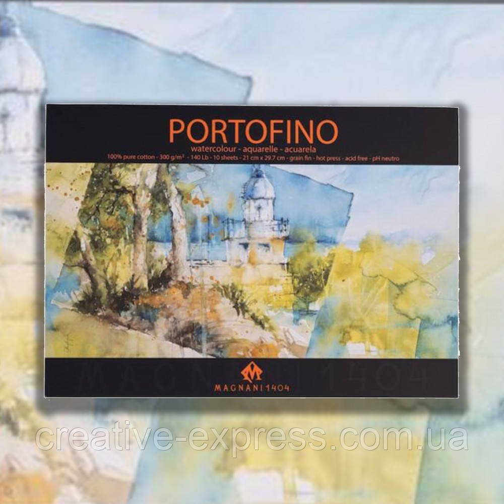 Папір ДЛЯ АКВАРЕЛІ з ГАРЯЧИМ ПРЕСОМ PORTOFINO 100% бавовняний папір – CARTIERA MAGNANI 1404 300 г/кв.м – цей папір був виготовлений на циліндрично-формовій машині за допомогою фетрових машин ексклюзивного дизайну Magnani 1404. Його 100% бавовняний склад і повна відсутність кислот і похідних хлору надають цьому паперу стійкість до пожовтіння від ультрафіолетових променів, гарантуючи довговічність протягом багатьох років і максимальну ефективність нанесених кольорів. Папір Acquerello PORTOFINO особливо популярний для всіх мокрих технік, таких як акварель, гуаш, туш і акрил.