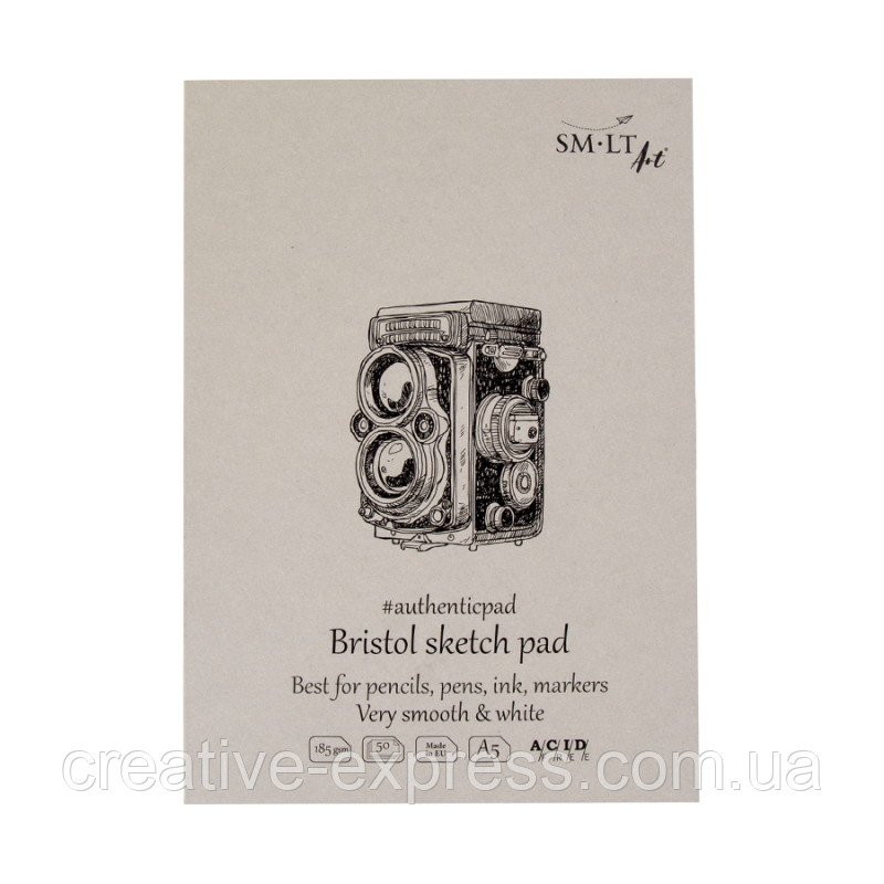 Блокнот-склейка для ескізів AUTHENTIC (Bristol) А5, 185г/м2, 50л, білий та гладкий папір, SMILTAINIS