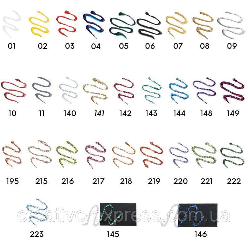 Relief Deco Glass Contour Paint доступна в різних кольорах, включаючи металік і блиск, для різноманітних ефектів залежно від ваших потреб. Фарба висихає протягом декількох годин, а після висихання стійка до стирання і миття. Його можна наносити пензлем, шпателем або прямо з тюбика, що дає можливість створювати різноманітні ефекти та текстури.