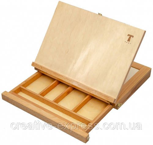 Конструкція дерев’яного ящика ергономічно поєднує планшет формату A4 і висувний ящик з секціями для художнього інструменту. Планшет має ступінчасте регулювання кута нахилу на 4 позиції і маленьку полку для опори роботи.