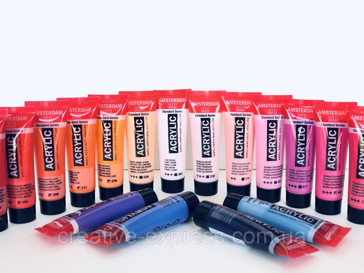 Акрилові фарби Amsterdam мають високий рівень світлостійкості, завдяки використанню натуральних, стійких пігментів. Вони прості у використанні, легко розбавляються водою, швидко сохнути, практично без запаху, все це дозволяє працювати ними в домашніх умовах. Завдяки особливому зв’язку язуючому, фарби прекрасно підходять для виконання робіт не тільки на полотні, а й на стінах, дереві, пластику, металі. Палітра: 80 кольорів, у тубах 20, 75, 120 і 250 мл та в банках 500 мл