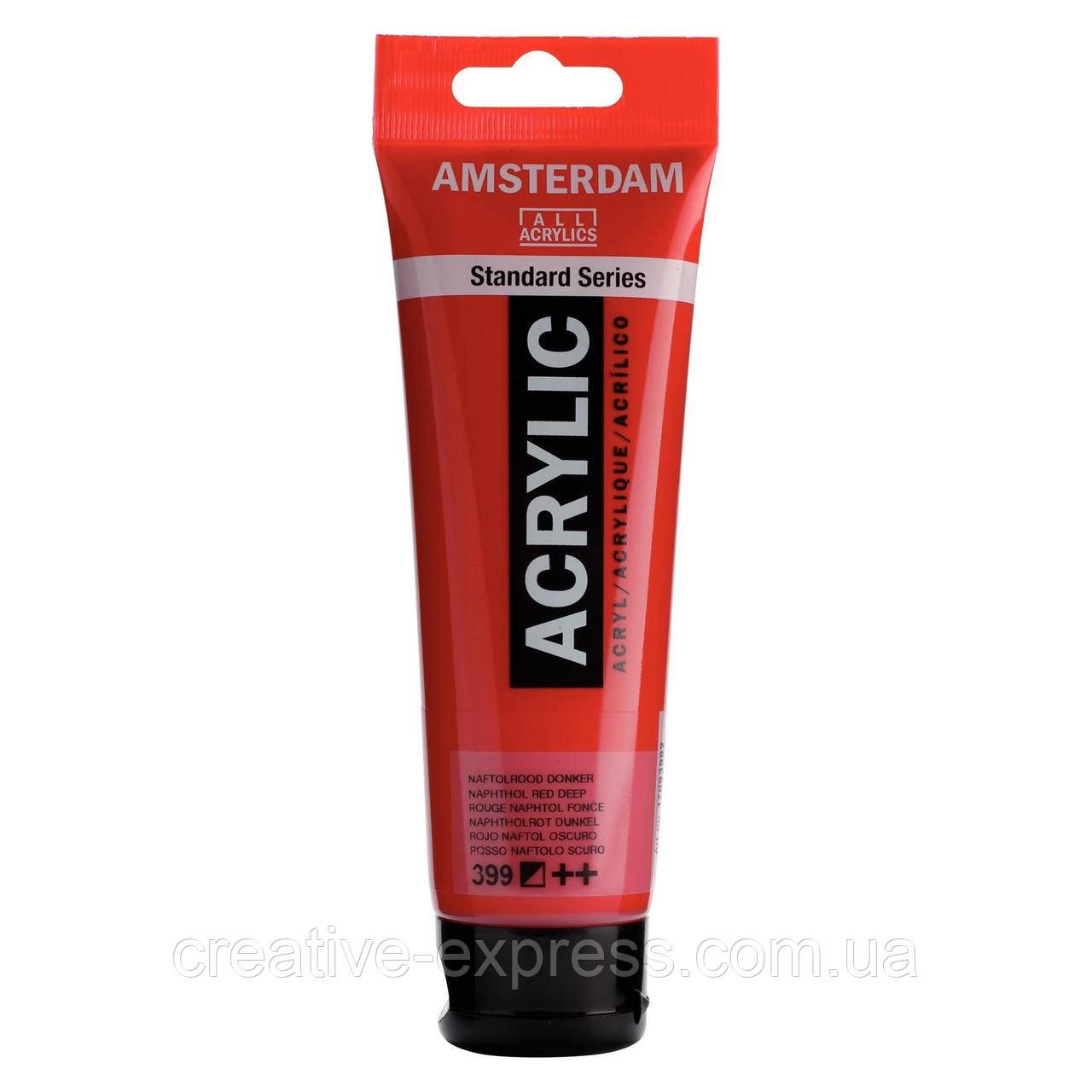 Акрилові фарби Amsterdam мають високий рівень світлостійкості, завдяки використанню натуральних, стійких пігментів. Вони прості у використанні, легко розбавляються водою, швидко сохнути, практично без запаху, все це дозволяє працювати ними в домашніх умовах. Завдяки особливому зв’язку язуючому, фарби прекрасно підходять для виконання робіт не тільки на полотні, а й на стінах, дереві, пластику, металі. Палітра: 80 кольорів, у тубах 20, 75, 120 і 250 мл та в банках 500 мл