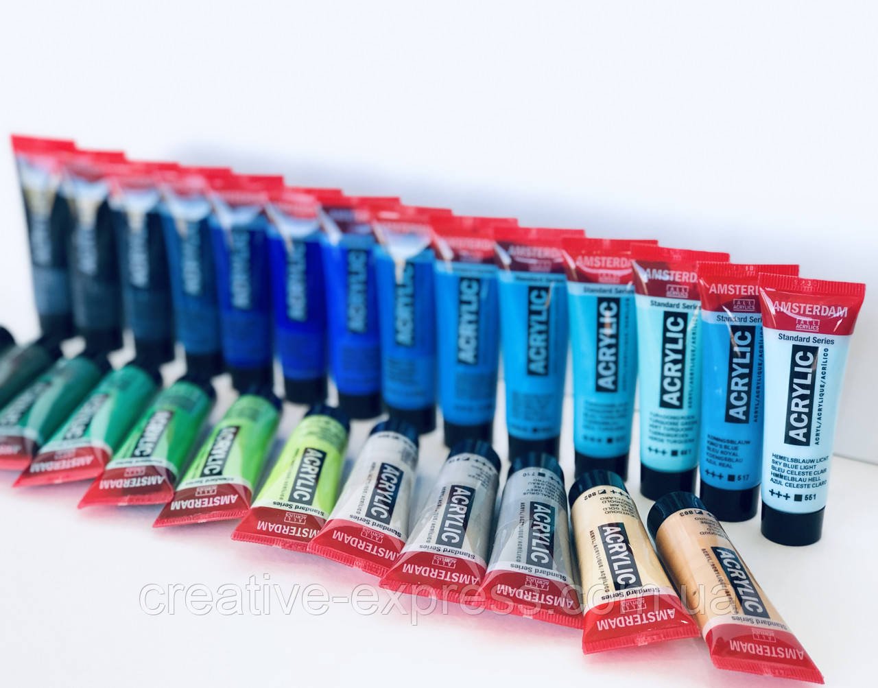 Акрилові фарби Amsterdam мають високий рівень світлостійкості, завдяки використанню натуральних, стійких пігментів. Вони прості у використанні, легко розбавляються водою, швидко сохнути, практично без запаху, все це дозволяє працювати ними в домашніх умовах. Завдяки особливому зв’язку язуючому, фарби прекрасно підходять для виконання робіт не тільки на полотні, а й на стінах, дереві, пластику, металі. Палітра: 80 кольорів, у тубах 20, 75, 120 і 250 мл та в банках 500 мл