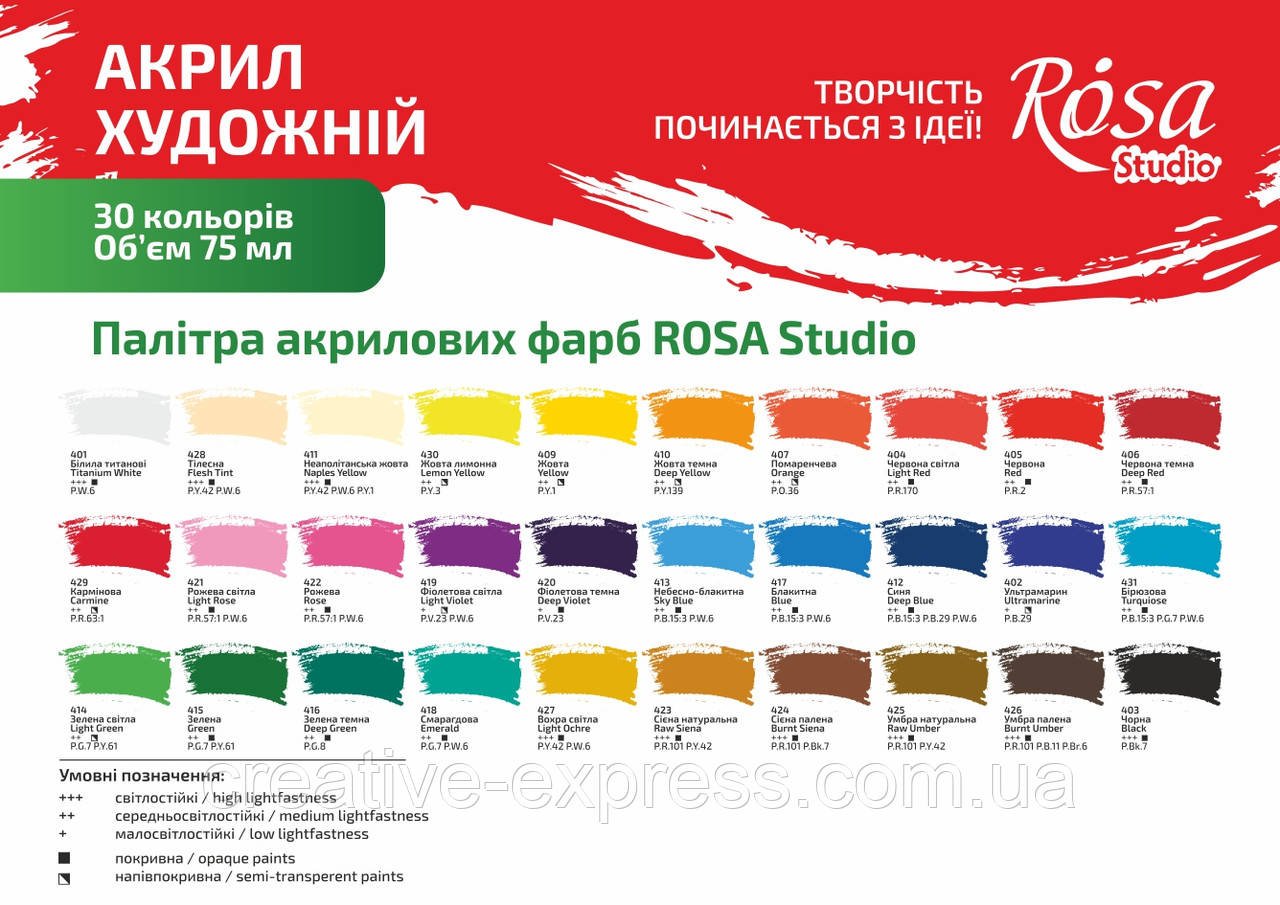 Вони також можуть служити основою для роботи в інших видах технік. Акрил можна цікаво комбінувати з олією, аквареллю, гуашшю, пастеллю. Характеристики художнього акрилу ROSA Studio: Насичені кольори, які легко змішуються і утворюють нові відтінки Фарби мають гарну покривну здатність Завдяки оптимальній в язкості фарби, в роботі можна використовувати різноманітні інструменти (пензлі, мастихіни тощо) Легкий блиск після висихання додає акрилу своєрідного шарму Після висихання утворює еластичну незмивну плівку, яка з часом залишається такою ж Фарба рівномірно розноситься по поверхні Чудово змішується з водою та швидко висихає Акрил легко наноситися на полотно, картон, папір, дерево та інші поверхні