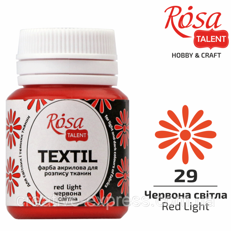 Головна Хоббі та декор Розпис по тканині та шовку Фарба акрилова для тканин, Червона світла (29), 20мл, ROSA TALENT
