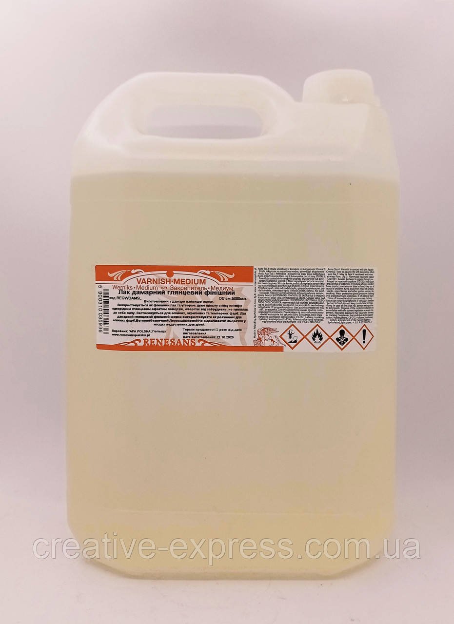 Лак даммарний глянцевий Renesans / 5 000 мл – захищає і надає роботі глянцевого покриття. Це робить поверхню малюнку більш рівномірною, кольори здаються більш насиченими і глибокими.