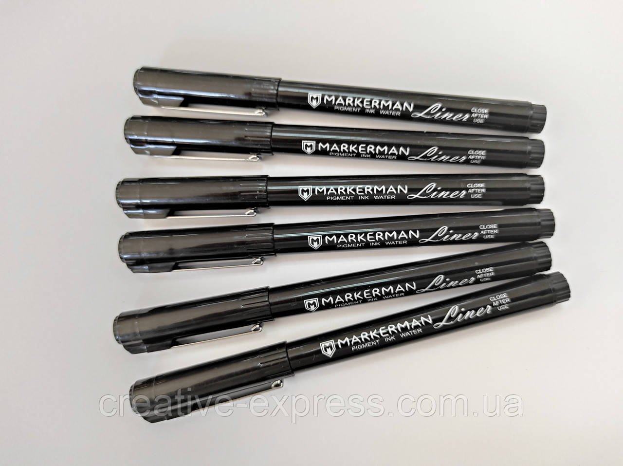 Лінер Markerman – має широкий вибір товщини. Від 003 до 10 . Швидковисихаючі чорнила не розтікаються і светоустойчивые. Чорнило на водній основі прекрасно лягають на поверхню, зберігаючи чіткість лінії і інтенсивність кольору. Після висихання не розмиваються водою. Чудово підходить для різних твердих і гладких поверхонь . Можна поєднувати в роботі з акварельними маркерамі і акварельними фарбами.