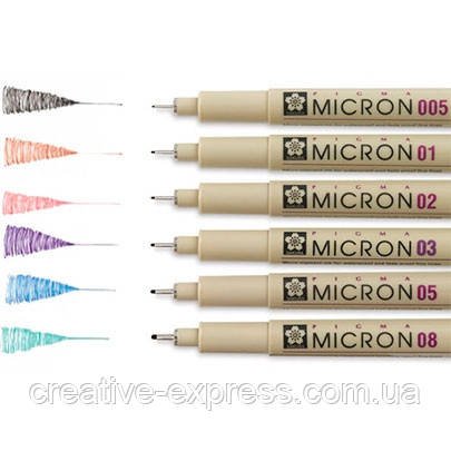 Лайнери PIGMA Micron від Sakura – професійні лайнери з микропигментним чорнилом. Водостійкі пігментні архівні чорнила на водній основі. Світлостійкі та стійкі до розтирання. Не протікають навіть через дуже тонкий папір, не засихають, на протязі декількох днів при відкритому ковпачку. Лайнери PIGMA Micron від Sakura ідеально підходять для скетчів, ілюстрацій, креслення, листи, записи в щоденниках, архівах, довідниках і т. д.. З лайнерами PIGMA Micron ви з легкістю можете малювати ідеально чіткі лінії однакової товщини, практично за будь-яким кутом.