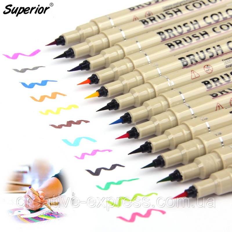 Маркери акварельні SUPERIOR поєднують професійний дизайн і відмінну якість у величезній рамі відтінків (88 кольорів). Маркер має наконечник типу щітки (ручка).SUPERIOR, ві можете знайте в золотих, срібних та неонових відтінках для покращеня Ваших робіт.