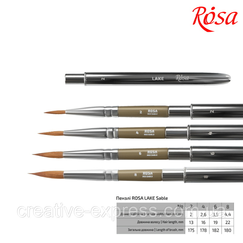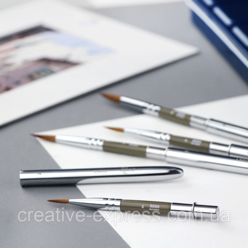 Кисті серії TRAVEL BRUSH ROSA обладнані спеціальним захисним ковпачком, який захищає волосся від механічних пошкоджень при транспортуванні: робоча частина кисті від’єднується від металевої ручки і ховається всередину ковпачка. Це робить його компактним і дозволяє легко поміститися в пенал або кишеню. Такі кисті ідеально підходять для створення акварелей, скетчів в подорожах і на пленері. Кисті LAKE ROSA з міксу соболя і унікального синтетичного волоса мають традиційну круглу форму волосяного пучка і особливу конструкцію TRAVEL BRUSH. Натуральний соболь робить кисть м’якою, а синтетичне волосся додає пружність і витривалість. Завдяки формою і властивостями волосся кисті LAKE є універсальними для всіх технік акварельного живопису.