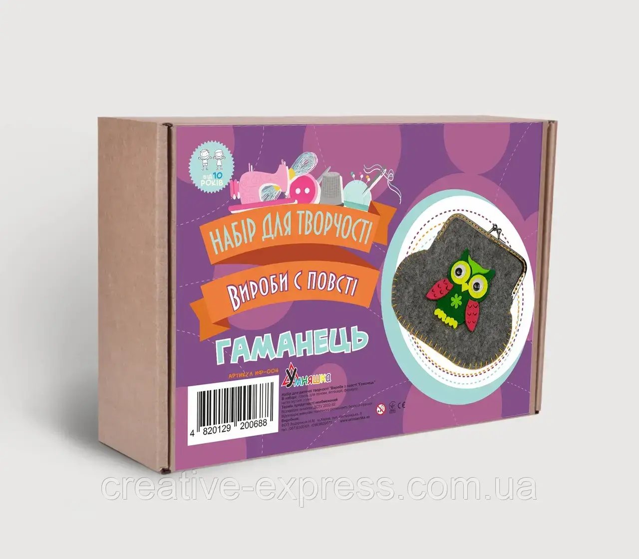 Розмір коробки ДхШхВ см -23,3х6,2х15,2. Розмір готового виробу: ДхШ, см – 13,2х10,7. У наборі: фетр для основи, аплікація з фетру, фермуар, нитки муліне, голка, форма. Для дітей від 10 років.
