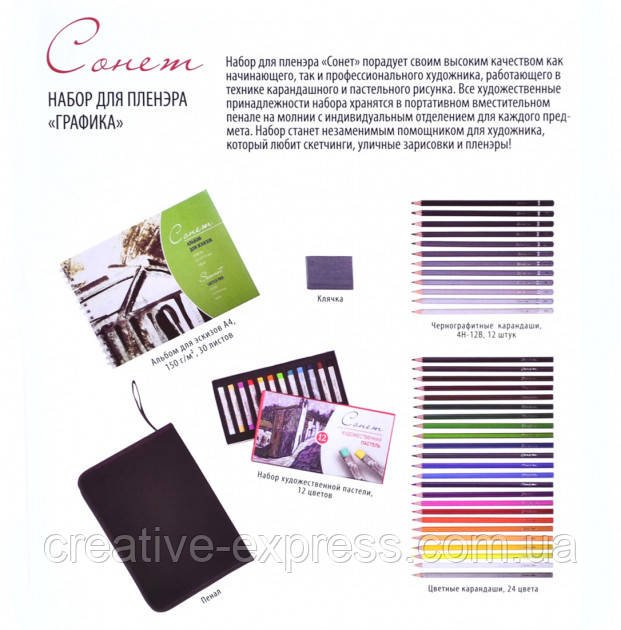Набір для пленеру «Сонет» порадує своєю високою якістю як початківця, так і професійного художника, що працює в техніці олівцем і пастельного малюнка. Всі художні приналежності набору зберігаються в портативного місткому пеналі на блискавки з індивідуальним відділенням для шкірного предмета. Набір стане незамінним помічником для художника, який любити скетчінга, вуличні замальовки і пленери.