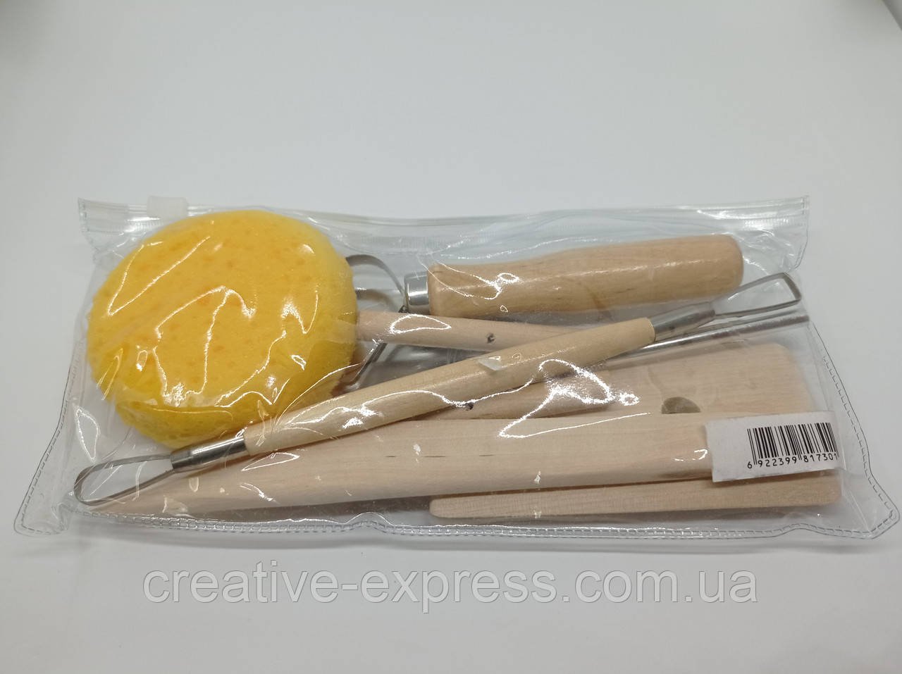 Набір включає в себе: 1 різець дерев’яна яний, 1 стек дерев’яна яний, 2 стек-петлі, 1 губка з поролону, 1 шило з нержавіючої сталі, 1 сталевий дріт, 1 скребок алюмінієвий.