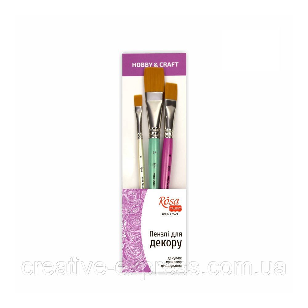Пензлі для декору ROSA TALENT доступні для замовлення поштучно та у сформованих наборах, розміри та форми пензлів підібрані згідно найпопулярніших технік декору.