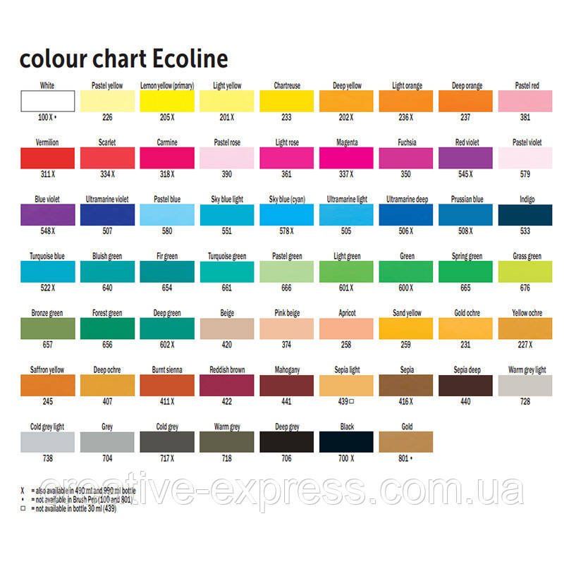Фарба акварельна рідка, Ecoline TalensEcoline – рідка акварельна фарба готова до використання. Палітра включає 46 яскравих прозорих кольорів та два непрозорі – білий та золотий. Фарба гарно наноситься на папір та картон.Гама: 48 кольрів в банці 30 млВиробник: “Royal Talens”, Нідерланди