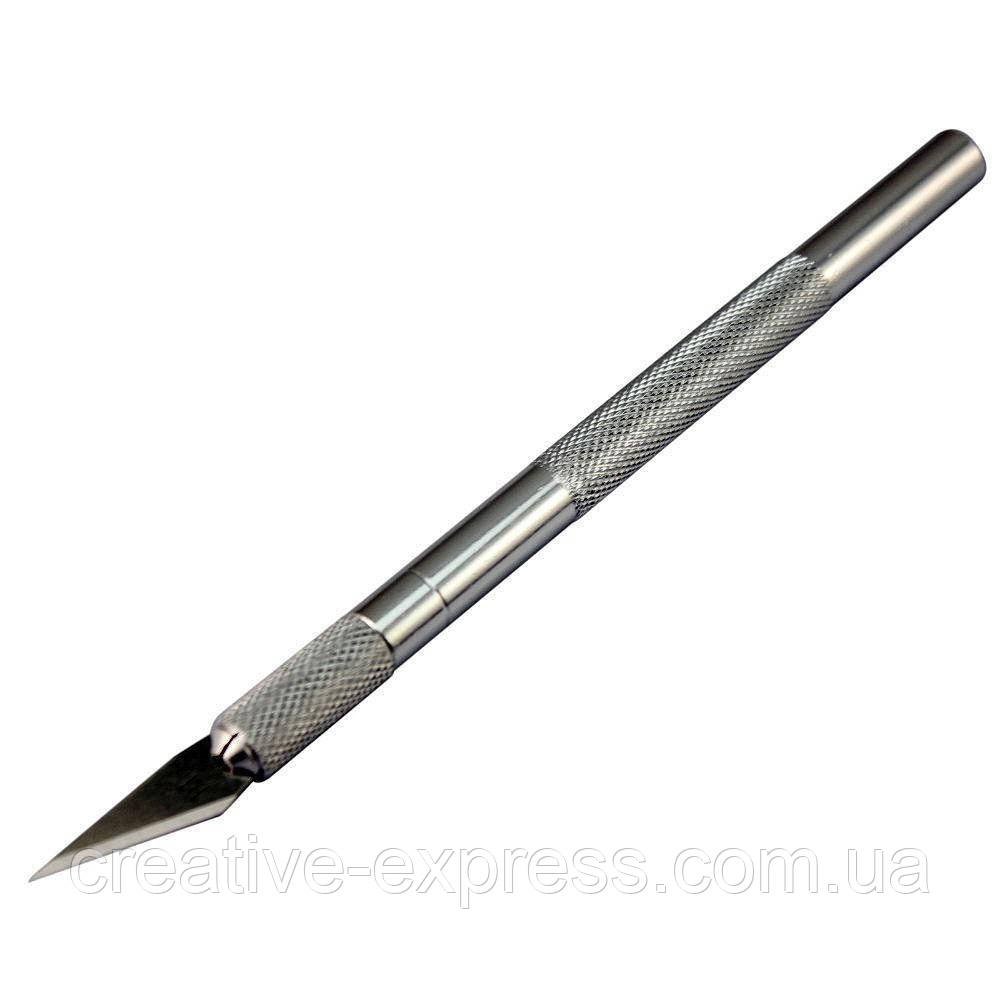 Професійний макетний ніж з 3-ма лезами. Ніж призначений для точної різки паперу, картону, тканин, заточування олівців, для вирізання дрібних деталей і складних фігур. Такі ножі широко застосовуються в макетуванні, моделюванні, при роботі з матеріалами з пластику, при створенні аплікацій, біжутерії, декоративних робіт і робіт у техніці скрапбукінг. Ніж складається з металевої рукоятки і тонкого змінного леза із захисним ковпачком. Цанговий механізм кріплення леза забезпечує надійність і безпеку в роботі. В комплекті 3 змінних леза.