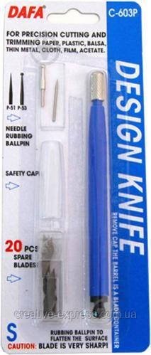 Ніж макетний З-603Р, пластикова ручка, 20 змінних лез + 2 насадки, DAFA
