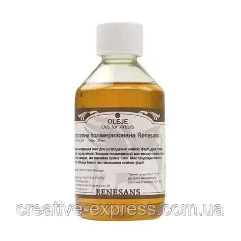 Олія лляна, полімеризованої Renesans – згущене натуральне масло для розведення олійних фарб, дуже клеєння, усуває слід кисті. Завдяки полімеризації має високу ступінь у язкості і сохне швидше, ніж звичайне лляне масло. Має тенденцію жовтіти з часом. Збільшує блиск і час висихання олійних фарб.