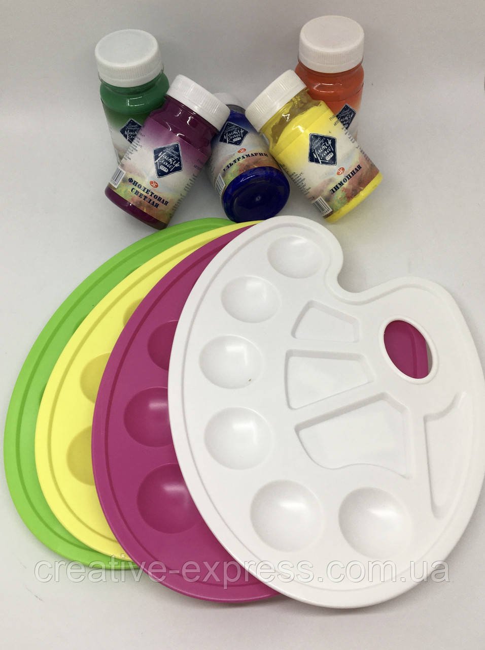 Палітра пластикова – невелика тонка і легка овальної форми, на якій художник змішує фарби під час роботи. Палітра має отвір для великого пальця руки. Ідеально підходить для акрилового живопису, а також для живопису гуашшю. Також може вікорістовуватіся в акварельним живописі.
