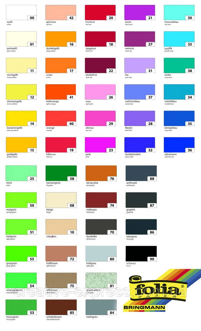 Використовується в основному для дизайну, виготовлення плакатів, макетів, для графіки, малюнку.Відмінно підходить для виготовлення листівок, запрошень, для скрапбукінгу. Також можна використовувати для рамок і паспарту, обрамлення вишивки та інших декоративних робіт. Гама: 47 кольорів Формати: В1 (70х100см), В2 (50х70см), А4 (21х29, 7см) Виробник: Folia, Німеччина