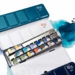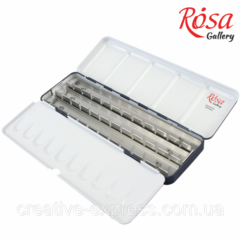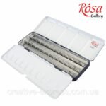 Металеві пенал для акварелі ROSA Gallery мають дві вбудовані палітри різної конфігурації, спеціальну вставку для кювету та зручний фіксатор для пальця на звороті пеналу, що дозволяє легко утримувати фарби в руці під час роботи.