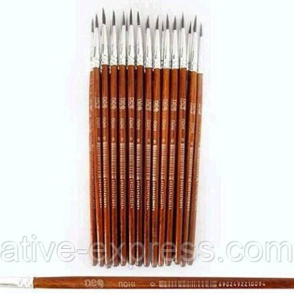 Натуральний ворс поні. Форма пучка ворсу – кругла. Дерев’яна забарвлена ручка жовтою емаллю. Безшовна алюмінієва обойма. Призначена для водорозчинних фарб – акварелі, гуаші, туші.