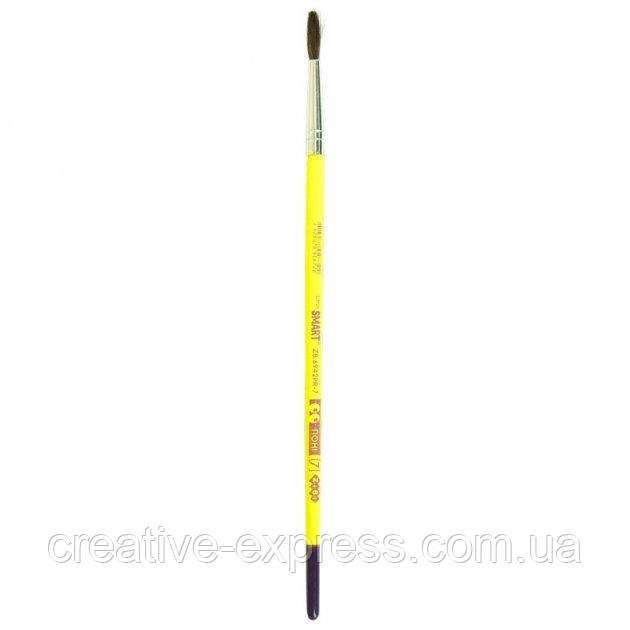 Натуральний ворс поні. Форма пучка ворсу – кругла. Дерев’яна забарвлена ручка жовтою емаллю. Безшовна алюмінієва обойма. Призначена для водорозчинних фарб – акварелі, гуаші, туші.