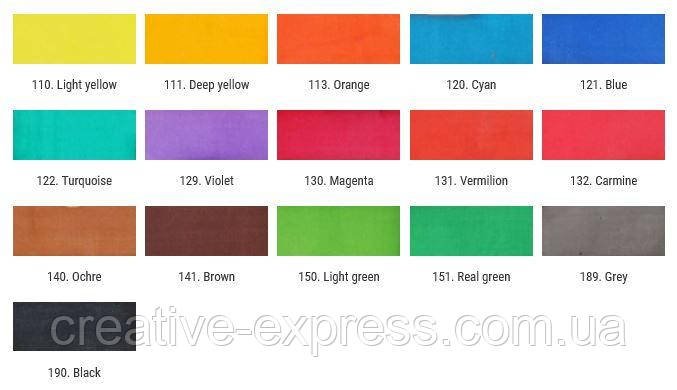 Шовкові акварелі для шовку, бавовни, вовни та інших натуральних текстильних виробів повинні бути закріплені прасуванню на іншій стороні текстилю. Шовкові фарби виробляються в Польщі у співпраці з відомим французьким Du Pont, компанія, що спеціалізується на виробництві шовкових та текстильних фарб. Вони доступні в 16 основних кольорах, всі з яких можна змішувати. Вони доступні в 50 мл та 100 мл пластикових баночок. Також є, наприклад, На замовлення – 500 мл та 1000 мл Кількість і якість нанесених пігментів забезпечують максимальну стійкість до світла та унікальний кінцевий ефект.