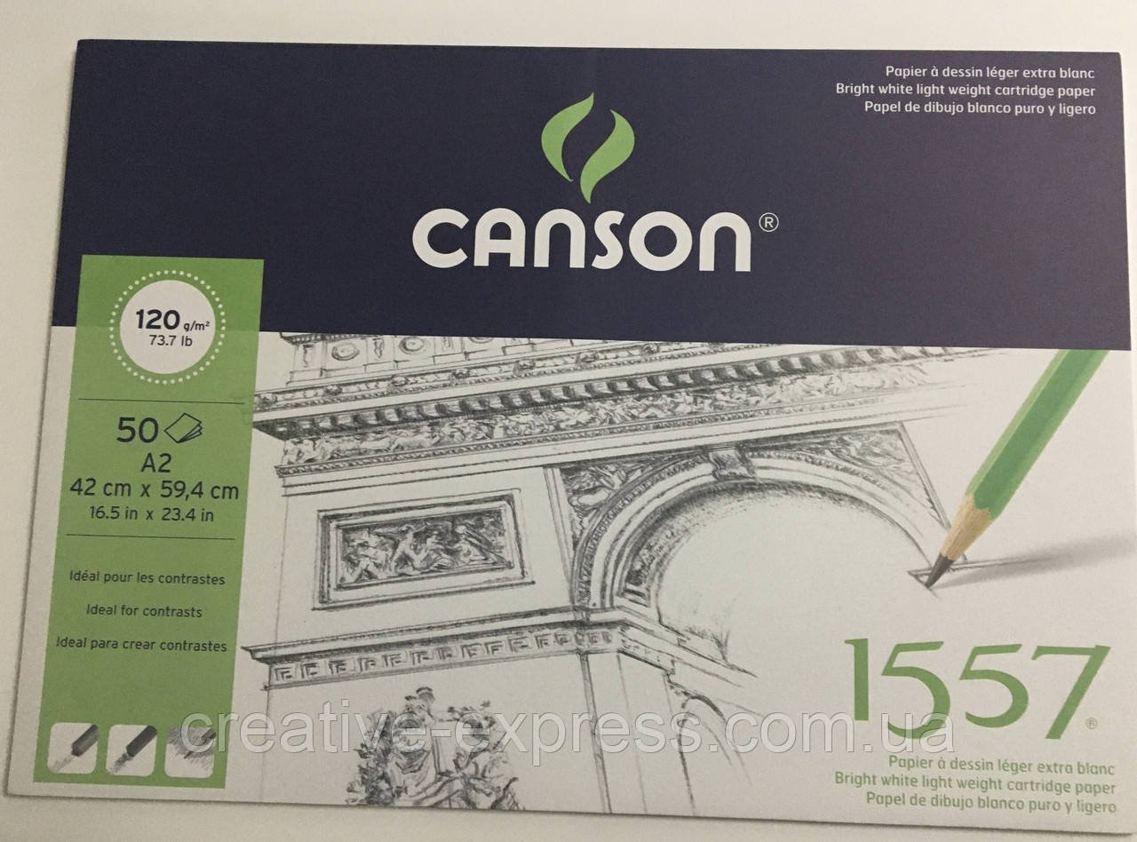 Папір “1557” від фірми Canson була колись розроблена спеціально для того, щоб художники могли в своїх роботах підкреслити, при необхідності, контрастність кольорів. Папір виробляється без додавання кислот. Висока щільність дозволяє багаторазово правити роботу. Особлива просочення забезпечує успішне втілення графічних ідей і сприяє тривалому зберіганню результату. Білосніжна поверхня має легкий од зернисту фактуру. Зерно паперу не дуже гладке, але і не дуже помітне, що дає нейтральну і тонку поверхню, яка відмінно підійде для ескізів і малюнків в “сухих техніках”. Папір “1557” можна багато в чому вважати універсальною: вона ідеальна для олівців, пастелі, вугілля і маркерів, але також підійде і для акварелі, гуаші, чорнила і ручок. У альбомів з папером “1557” задня частина обкладинки зроблена з щільного картону, що дає можливість малювати “на вазі