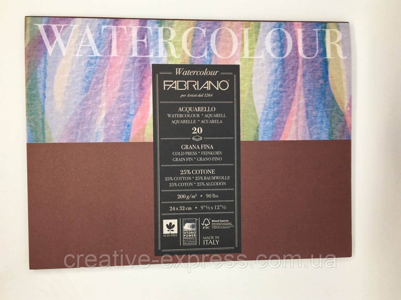 Акварельний папір серії “Watercolour” від FABRIANO (Італія) цінується за виняткову співвідношення ціна / якість. Цей папір популярна і у професійних художників, і у тих, хто тільки робить перші кроки в образотворчому мистецтві. Папір серії “Watercolour” робиться з суміші високоякісної целюлози і 25% натурального добірного бавовни. Вона не містить кислот, що гарантує збереження яскравості фарб на довгий час. Має особливу просочення, що забезпечує чітко вивірену ступінь поглинання пігментів. Висока щільність і міцність робить акварельний папір “Watercolour” від FABRIANO стійкою до багаторазових правками роботи. Колір паперу – білий. Фактура “Watercolour” – велике округле зерно, що дозволяє отримати гарний мальовничий ефект. Ідеально підійде для акварелі, гуаші, акрилу, темпери, чорнила, вугілля та інших подібних