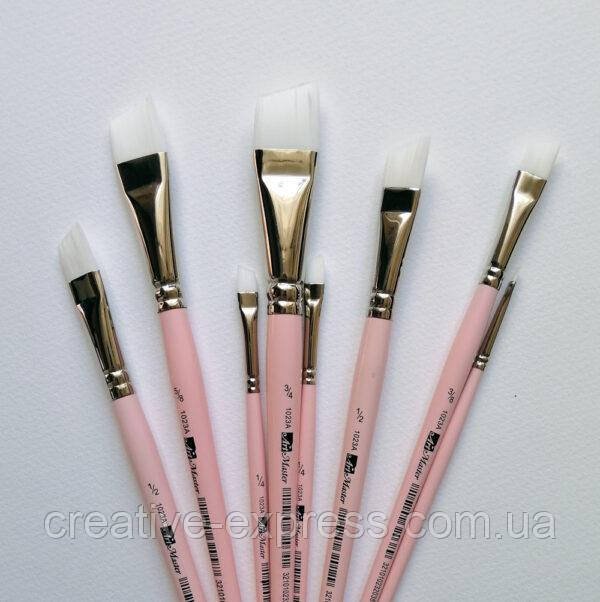 Синтетична Кисть коса 1 023 А ТМ ARTMaster. Має м’які м’який пружний ворс. Підходить для роботи різними фарбами. Наприклад; гуаш, акрил, темпера, а так само для косметичних та манікюрних робіт. Такі кисті дозволяють проводити дуже чіткі лінії, окреслюючи гострі кути. Так само, можна використовувати в техніці нанесення подвійного мазка. Ручка коротка дерев’яна яна покрита лаком.