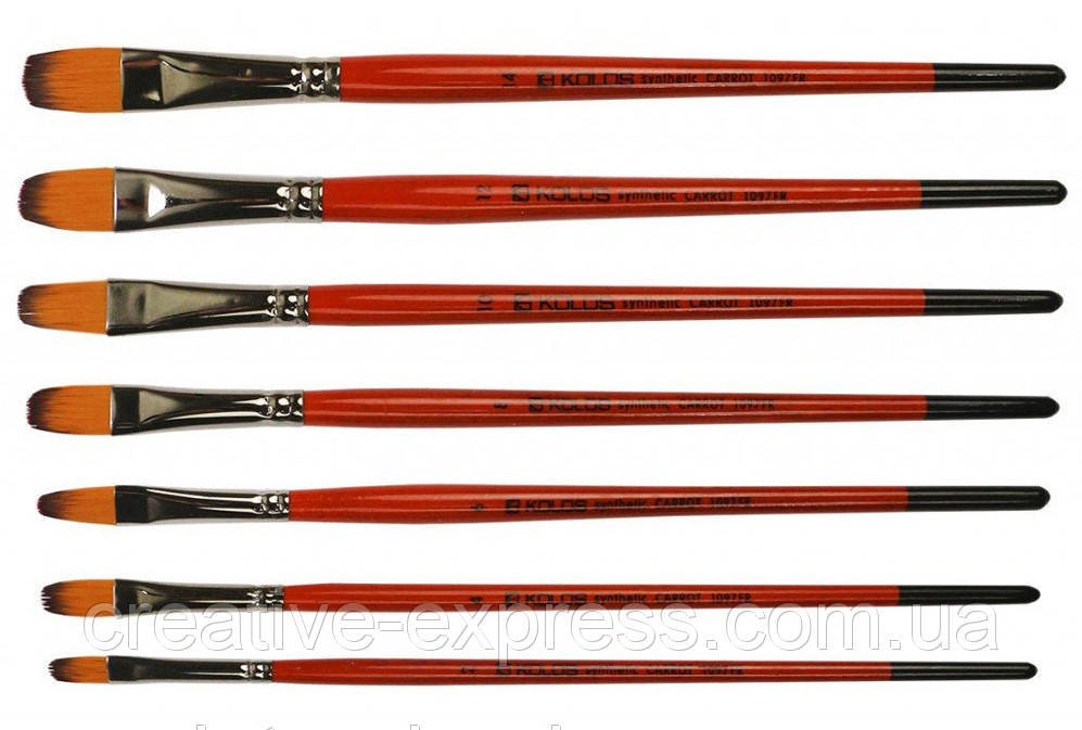 Пензель овальний з волоса синтетики. Стандартна виставка робочої частини. Рижа синтетика імітація колонка, відрізняється винятковою еластичністю і пружністю волосяного пучка. Універсальний пензель, його можна використовувати як звичайного плоского пензля і, в тій же година, в перпендикулярному положенні до поверхні – як круглим. Це – постійний лідер серед пензлів, використовуваних для переходу одного кольору в іншій. Добре поводяться з маслом і акрилом — як густим, так і розведеним. Пензель уявлень на короткій ручці
