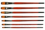Пензель овальний з волоса синтетики. Стандартна виставка робочої частини. Рижа синтетика імітація колонка, відрізняється винятковою еластичністю і пружністю волосяного пучка. Універсальний пензель, його можна використовувати як звичайного плоского пензля і, в тій же година, в перпендикулярному положенні до поверхні – як круглим. Це – постійний лідер серед пензлів, використовуваних для переходу одного кольору в іншій. Добре поводяться з маслом і акрилом — як густим, так і розведеним. Пензель уявлень на короткій ручці