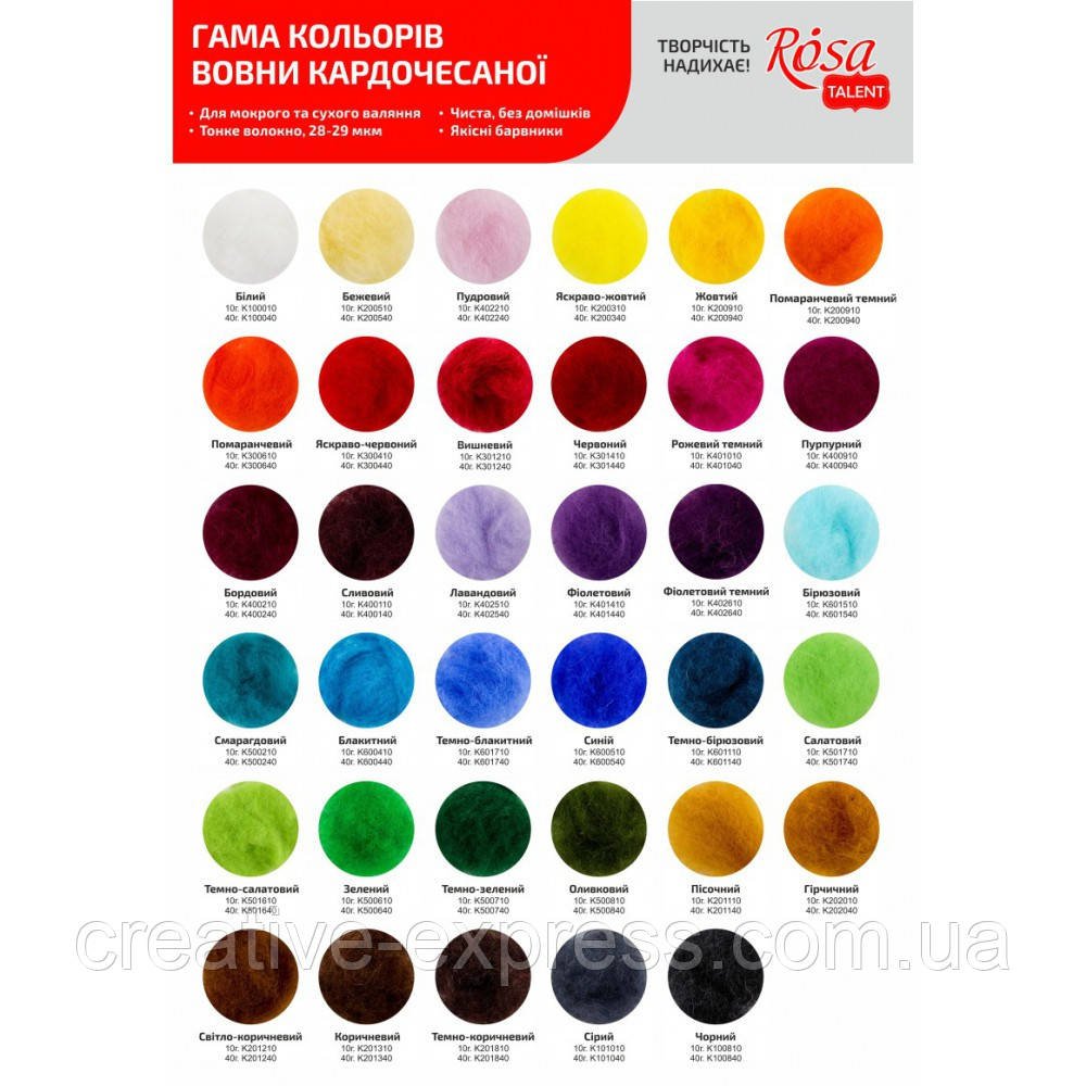 Вовна для валяння кардочесанія ROSA TALENT завдяки своїй структурі і розташуванню волокон, дає легке, щільне зчеплення і гладку поверхню при уваліваніі. Різноманіття відтінків дає волю фантазії і можливість малювання шерстю. Можливість легко зробити «акварельний» малюнок на виробах. Товщина вовняних волокон – 27 мкм, довжина – 65-100 мм, робить шерсть придатною, як у мокрому (для створення сумок, тапочок, валянок, поясів, біжутерії, предметів інтер’єру єру), так і в сухому (біжутерія, панно і іграшки) валяніі.Іменно ця шерсть підходить для новачків для освоєння техніки, вона просто відщипується, при цьому легко вгадати обсяг потрібно кількості вовни для вироби.