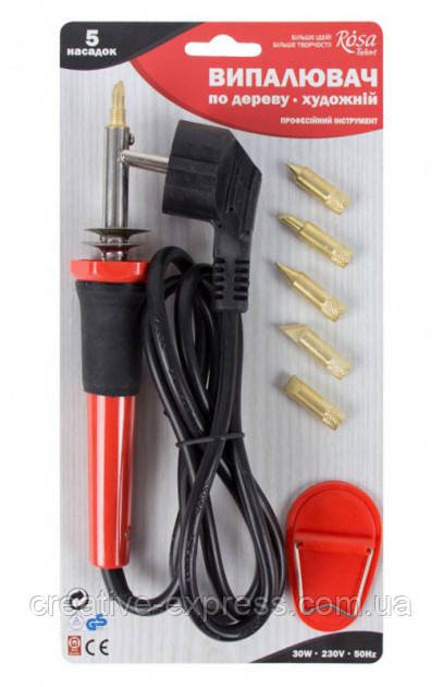 Художній випалювач по дереву з 5 насадками. Його використовують для художнього випалювання різних малюнків, декоративних елементів, букв на дереві, пробці, шкірі, фанері і т. д. Набір вміщує 5 насадок: – універсальна насадка, – точкові насадки, які використовуються для створення візерунків або написів; – довгі насадки – для створення ліній: тонких, широких або глибоких; – зі скошеними наконечниками – для додання тіні малюнку; – фігурні насадки – для створення візерунків; – насадка – ніж, яка вікорістовується для розрізання пінопласту, пластмаси або для заплавленим кінчіків стрічки з нейлону або інших синтетичне матеріалів, а також для розрізання стрічок.