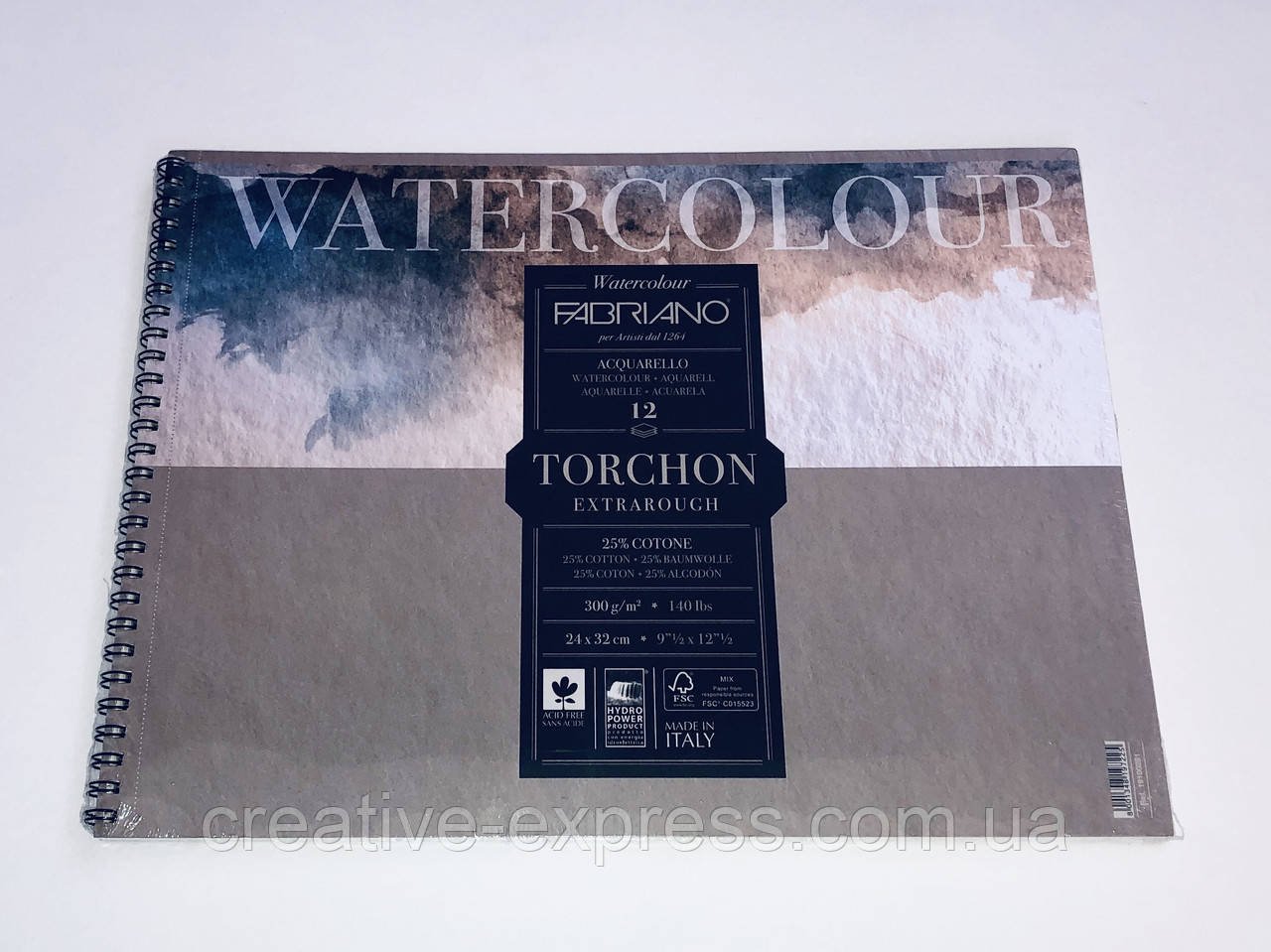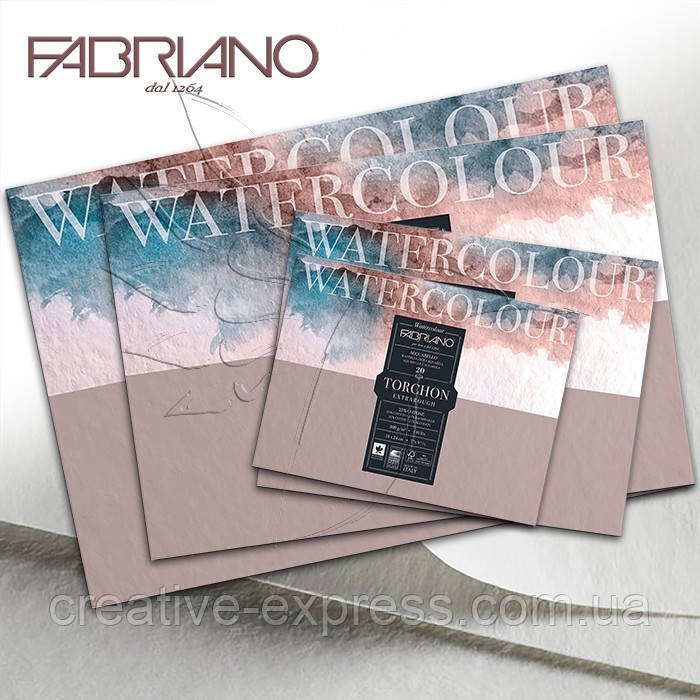 Акварельний папір серії “Watercolour” від FABRIANO (Італія) цінується за вийняткову якість. Цей папір популярний як у професійних художників, так і у тих, хто тільки робить перші кроки в образотворчому мистецтві. Папір серії “Watercolour” робиться з суміші високоякісної целюлози і 25% натуральної бавовни. Він не містить кислот, що гарантує збереження яскравості фарб на довгий годину, має спеціальне просочення, що забезпечує високий рівень поглинання пігментів. Висока щільність і міцність робить акварельний папір “Watercolour” від FABRIANO стійким до багаторазових виправлень робіт. Колір паперу – білий. Фактура “Watercolour Torchon” – великі зерно, що дозволяє отримати гарний мальовничий ефект. Ідеально підійде для акварелі, гуаші.